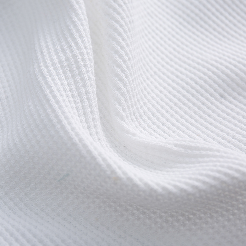 This cotton-spandex waffle fabric is made from 97% cotton and 3% spandex, featuring a classic waffle pattern that creates a delicate and regular grid effect. The fabric is 160cm wide, of uniform thickness, and weighs 190 GSM. The fabric is tightly woven and elastic, offering both stability and stretch. The unique cotton-spandex blend ratio allows the fabric to retain the natural feel of cotton while adding a slight stretch, resulting in a clear and layered structure.